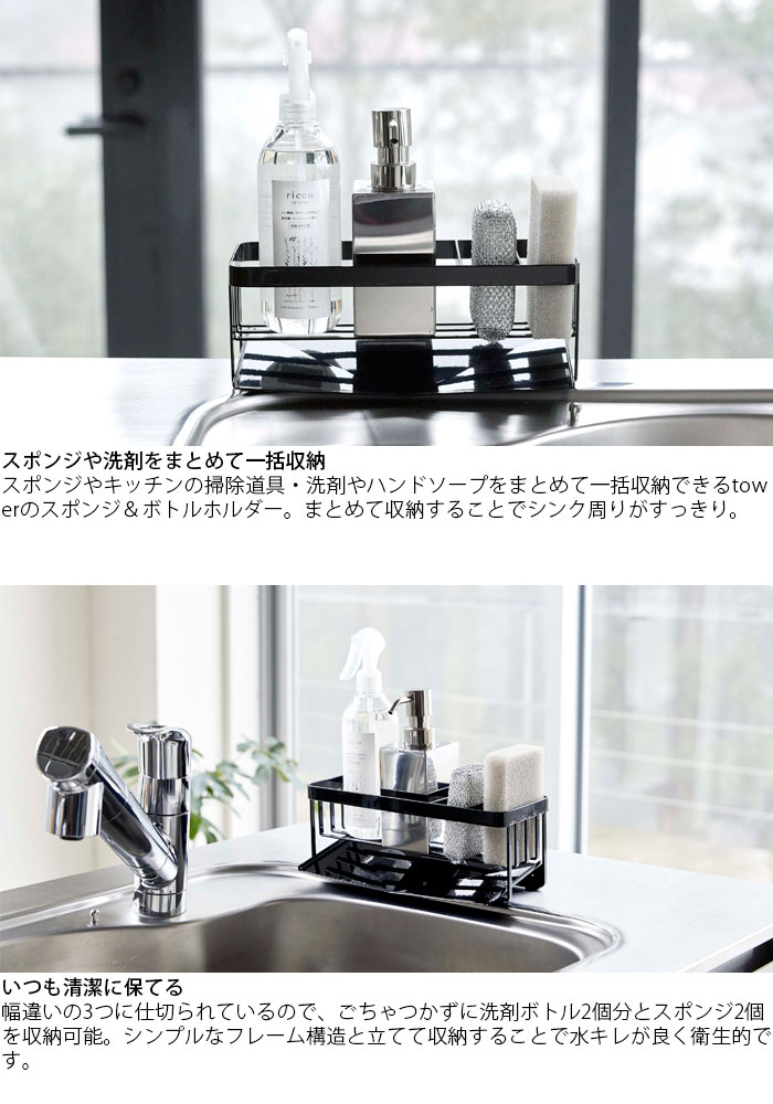 tower タワー 水が流れるスポンジボトルホルダー おしゃれ 山崎実業 ホワイト ブラック スポンジホルダー 収納 モノトーン キッチン シンク 洗剤 スポンジ ハンドソープ