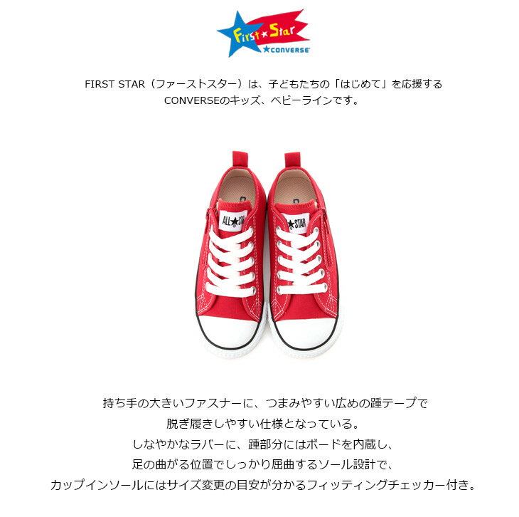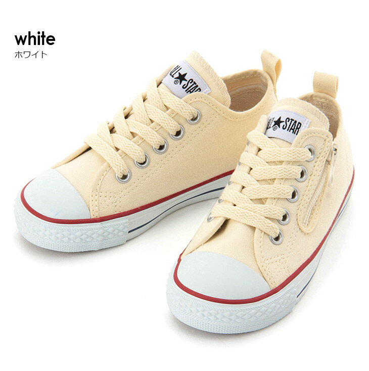 キーワード:綿 ファスナー ジッパー レースアップ 紐 履きやすい ブラック ホワイト レッド 黒 白 赤 小さいサイズコンバースの定番オールスターローカットのキッズモデル。