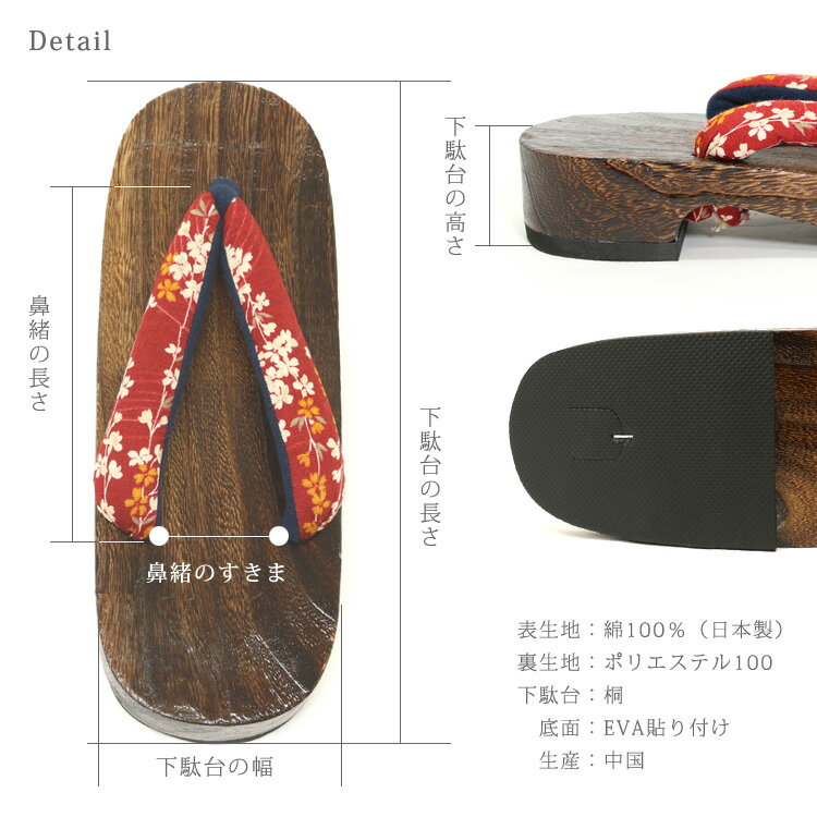 下駄台の長さ 約26.5cm 下駄台の幅 約9cm 下駄台の高さ 約4cm 鼻緒の長さ 約15cm 鼻緒のすきま 約5cm 商品 婦人桐下駄(ラージサイズ) 鼻緒 ベース色:赤系/エンジ系 ※鼻緒のデザインはお任せになります。