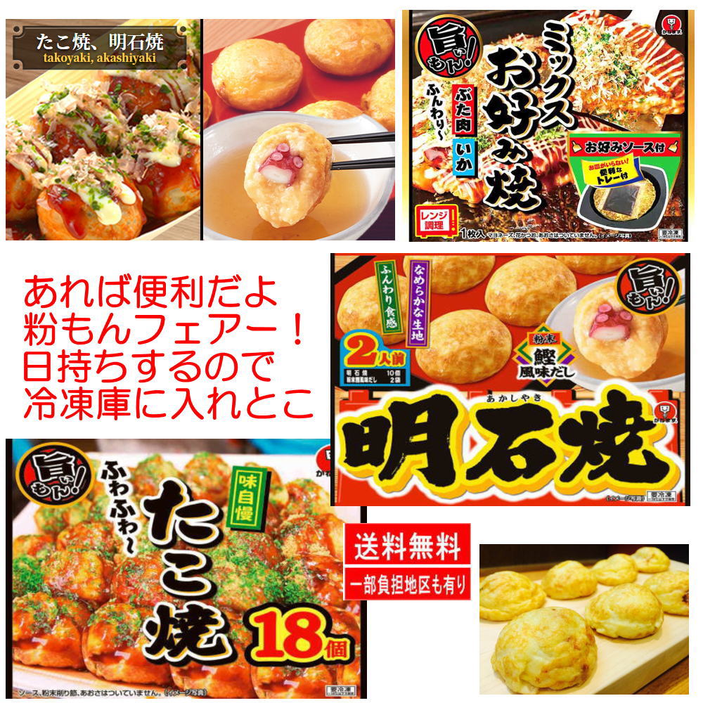 「いかえびお好み焼き」そば入お好み焼き「豚モダン焼」牛すじこんにゃく入り「ねぎ焼」「明太もちお好み焼き」に定番の「豚玉」 ●かねます食品から旨いもんシリーズ「ぶた玉・いかミックスお好み焼き」「たこ焼き18個」カツオだし付き「明石焼き2人前」3種を加えています。