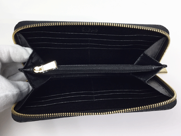 【仕様】正面上部にゴールドカラーのロゴ入り、マチ付き札入れ2、カードポケット12、ポケット1、ジッパー小銭入れ付き、中側に型押しロゴ入り、内部はロゴ柄生地、ジッパー持ち手にロゴ入り、中国製、※天然皮革ですので多少キズやしわ等有る場合がございます。