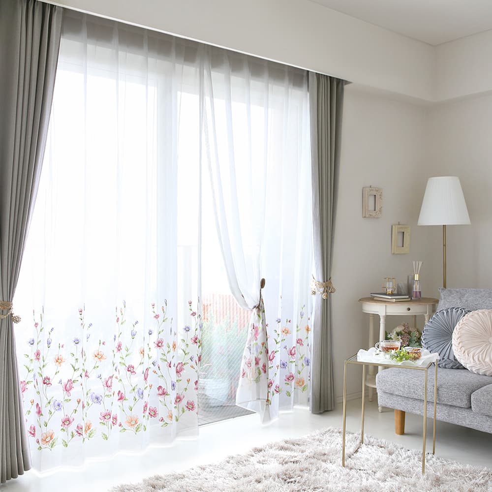 刺繍レースカーテン 刺繍で繊細に描かれた花々が彩る、優美で麗かな窓辺 <アンジュ> 機能: UVカット率64.9%・ウォッシャブル 付属品: アジャスターフックA or B 素材: ポリエステル100% 対応スタイル: 1.5倍ヒダ(2つ山) ヒダなし(フラット) 2倍ヒダ(3つ山) ⇒スタイルについて詳しくはこちら 色について: 各種コーディネート例の写真はイメージを重視しているため、部屋の照明によっては実際の色と異なって見える場合があります。